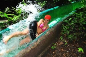 The jungle water slide! Itās a 400 meter (1300 feet) waterslide through the forest. So much fun for those who like fast zips, roller coasters and rides! Pro tip: Ladies ā wear shorts over your bikini bottoms. Do not just go in a bikini, even though they give you a tube, you can still get friction burn.